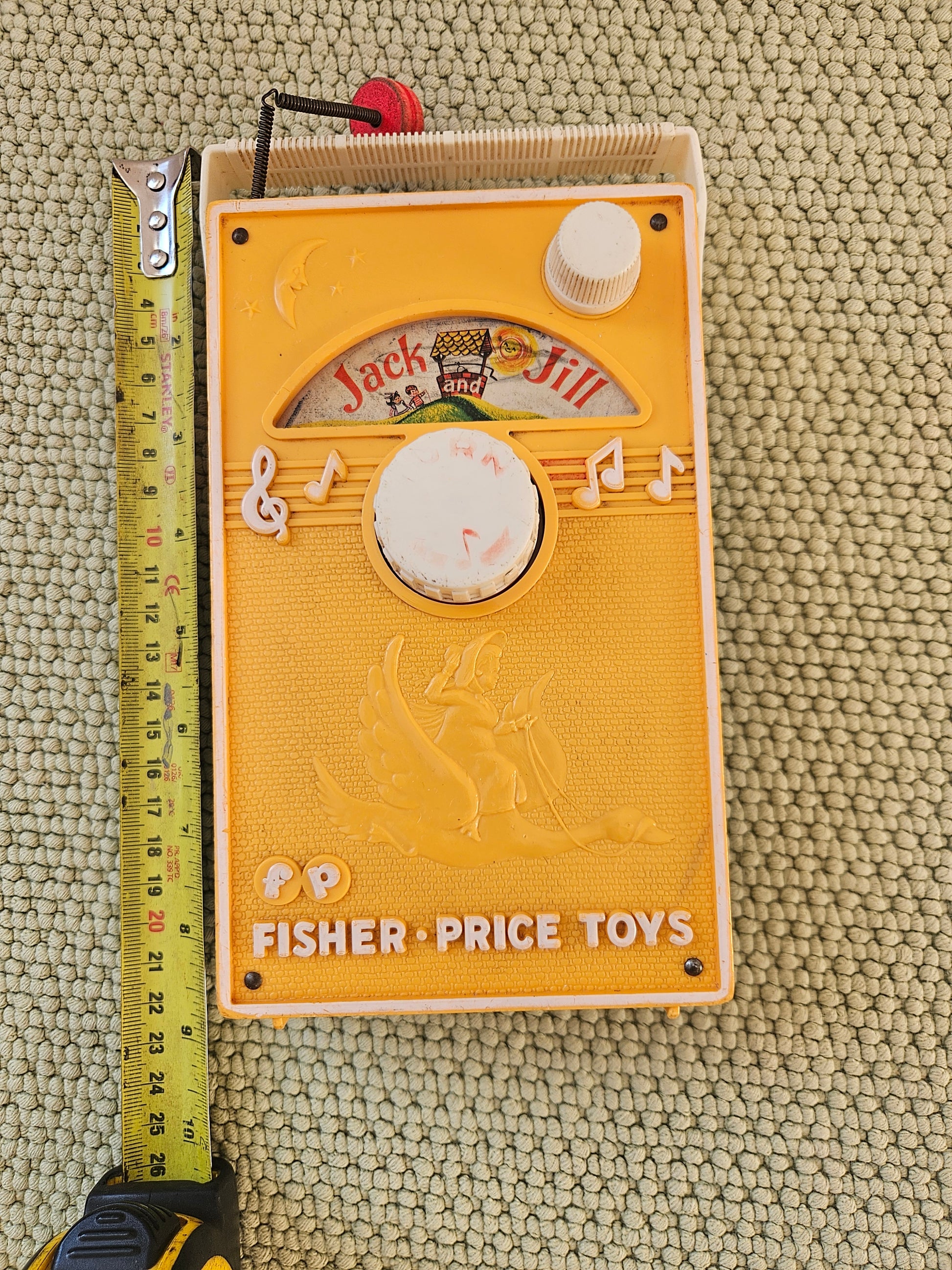 Originally from 1968 Fisher Price Toys. Turn the knob on the Music Box TV/Radio, watch the story move along as the melody of Jack and Jill plays through the vintage toy. Turning to the back, watch through the plastic window, as the mechanical music box turns and plays its sweet sound.