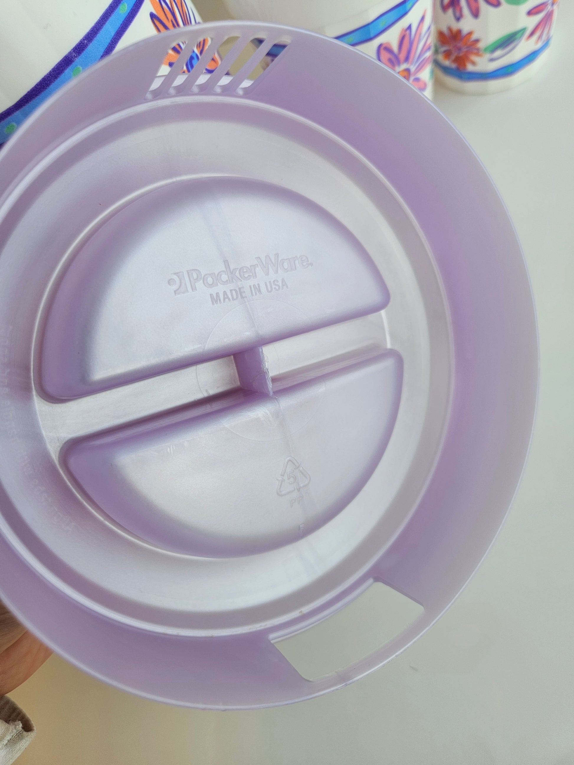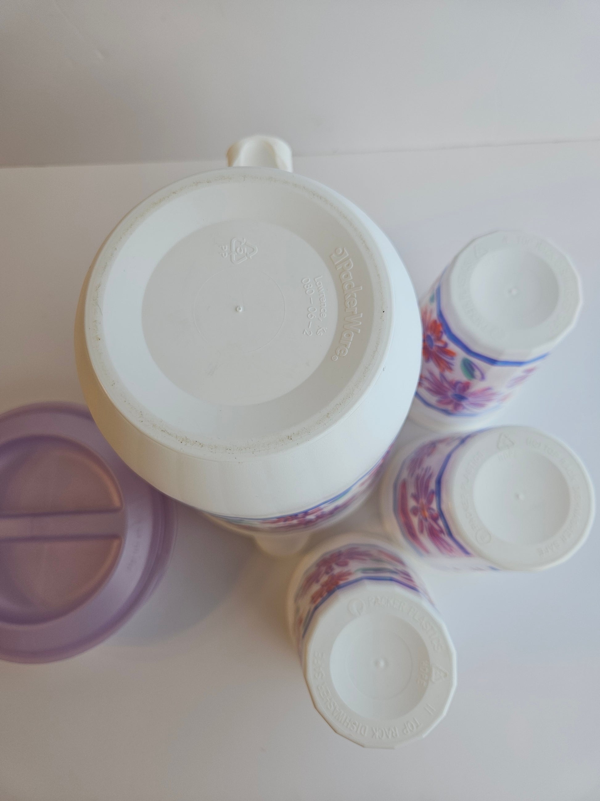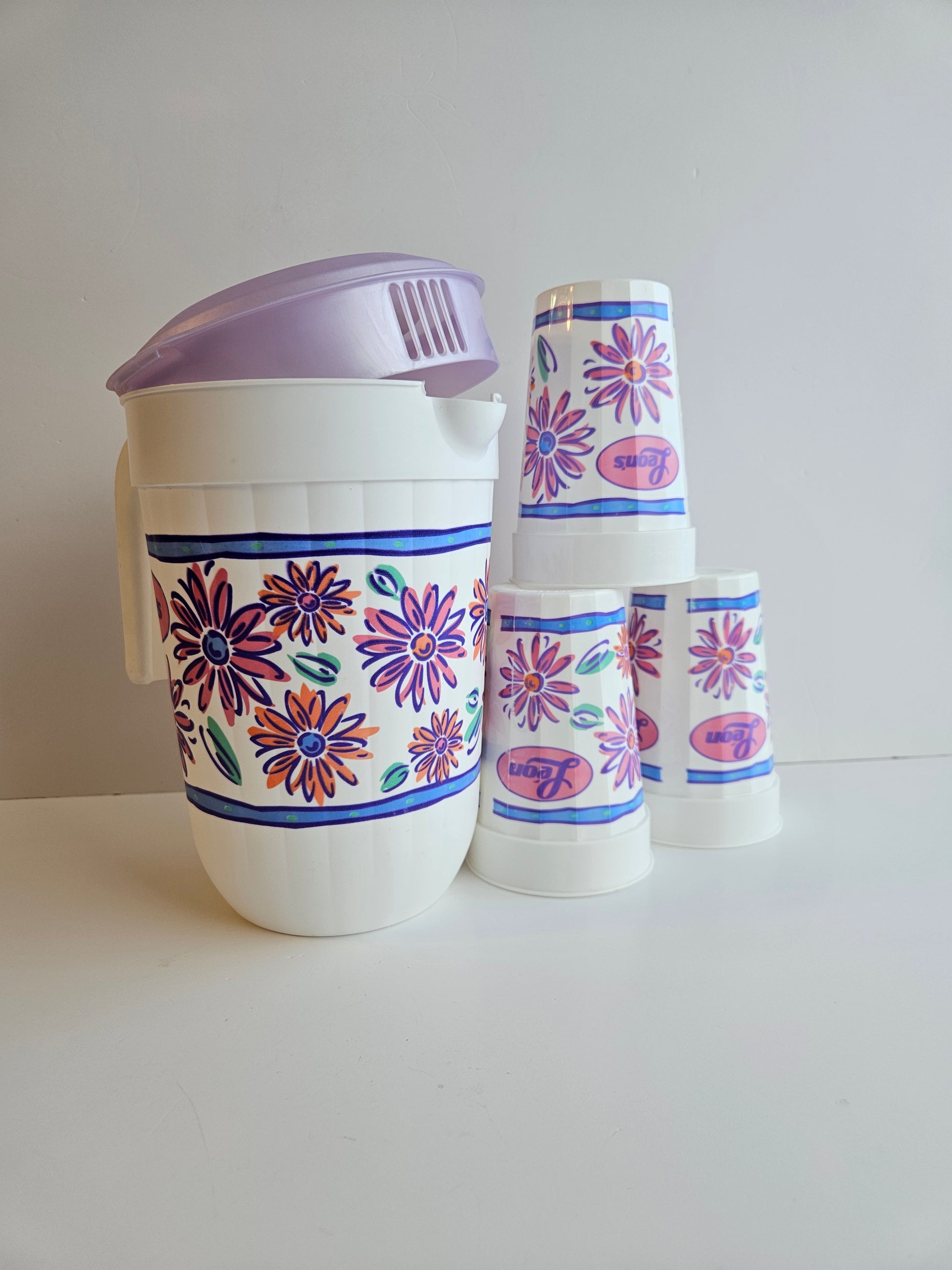 Originally made for Leon's by Packer Ware, USA. This fun and floral set includes a 2 Liter pitcher with handle and locking lid, and 3 plastic cups (3cups each).